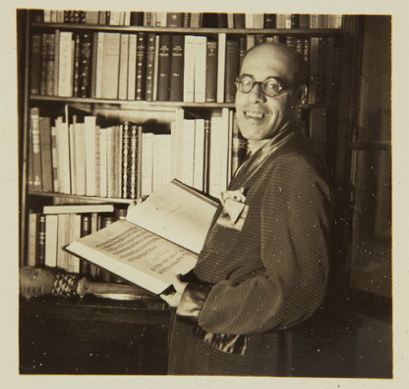 Mário de Andrade com livro na mão, em pé, junto a estante de livros, s. l. [1938]. Arquivo IEB/USP