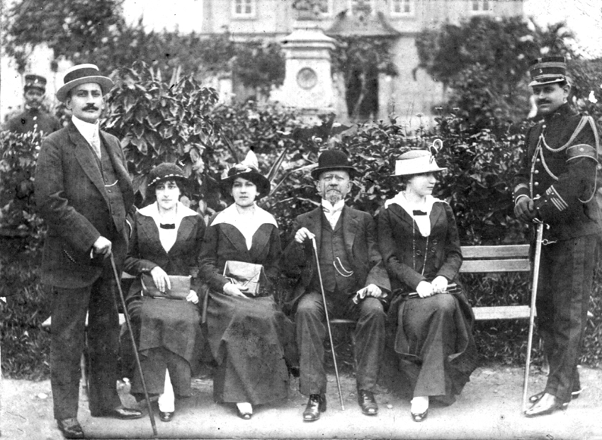 Rodrigues Alves e filhos em frente à Basílica Velha de Nossa Senhora Aparecida. Da esquerda para a direita: Oscar Rodrigues Alves, Isabel Rodrigues Alves, Maria Rodrigues Alves, Francisco de Paula Rodrigues Alves, Zaira Rodrigues Alves e o capitão Eduardo Lejeune (ajudante de ordens). 1913.